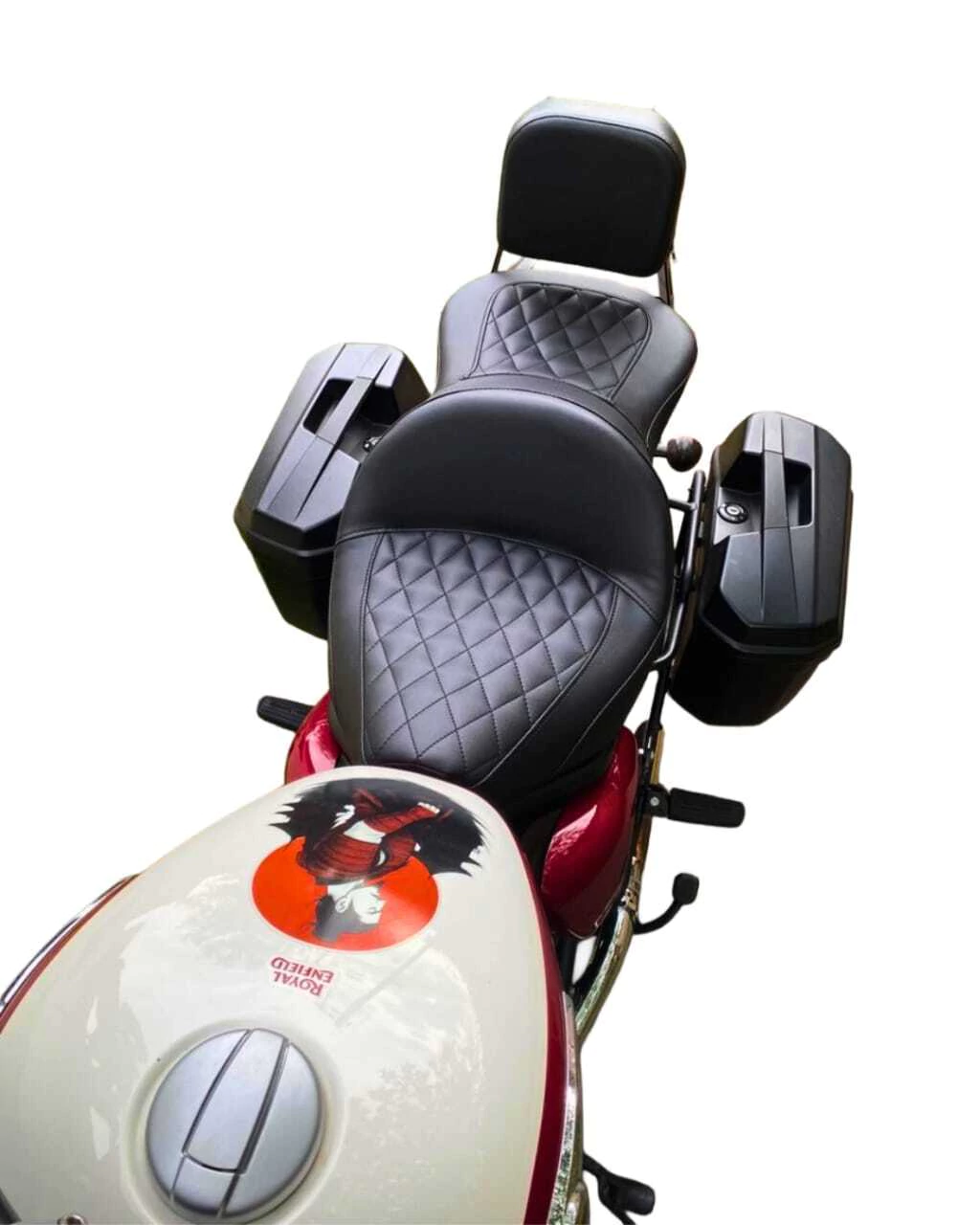 Produzido com material totalmente liso, o banco mantém uma estética moderna, elegante e contínua, acompanhando perfeitamente o design da moto. O acabamento personalizado reforça a identidade exclusiva do modelo, destacando o cuidado artesanal presente em cada detalhe.